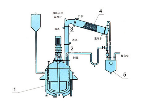 主要部件示意圖:1、反應鍋 2、豎式分餾柱 3、豎式冷凝器 4、臥式冷凝器 5、貯水器。